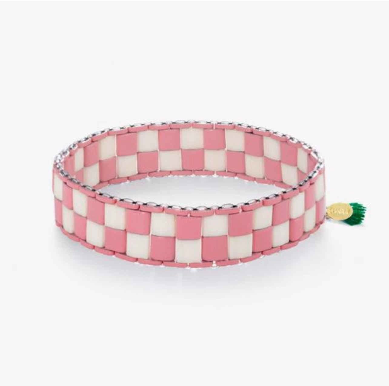 Mosaic Stretch Bracelet, a special nod honoring the checkerboard pattern. This mosaic checkerboard pattern used globally throughout various forms of art, architecture, fashion, music, technology, science, board games and more. Enamel beads intricately woven on comfortable stretch cord, for adjustable sizing. Easy to wear elegance.